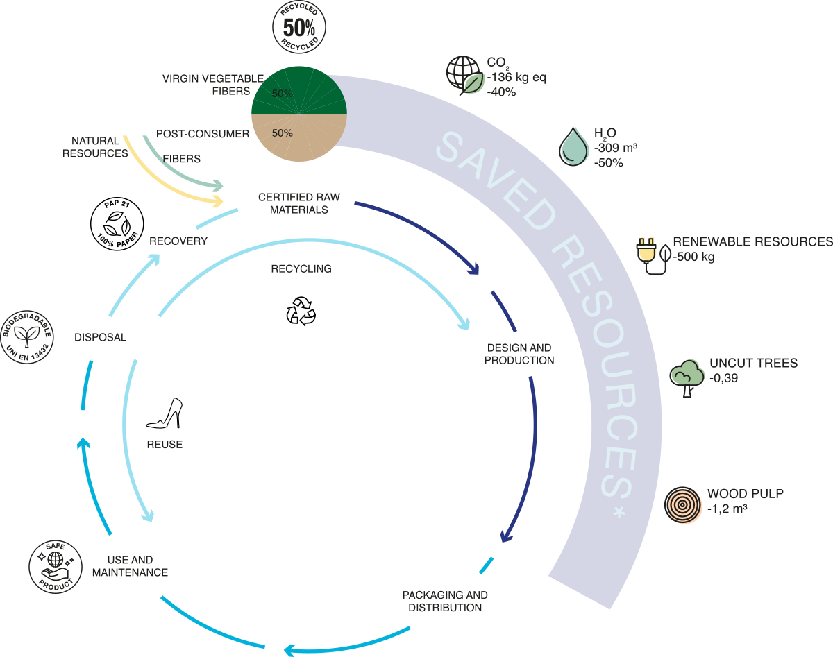 *Theoretical savings values with the use of recycled paper compared to virgin paper per ton (LCA Study - ERGO - Scuola Superiore Sant'Anna - Pisa)